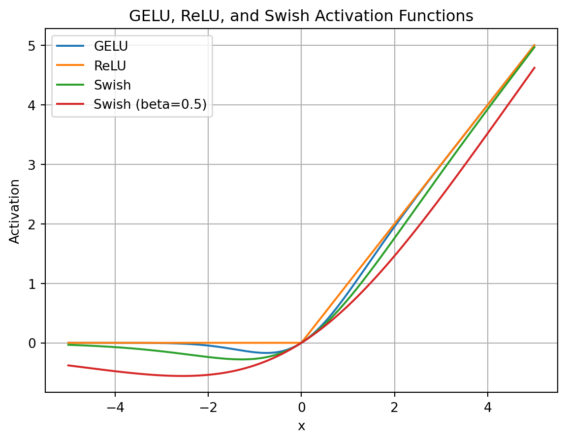 \[\text{SwiGLU}(x) = (x \odot \sigma(W_1 x + b_1)) + \gamma \odot (x \odot \sigma(W_2 x + b_2))\]其中,$x$ 是输入向量,$W_1, W_2$ 是两组线性变换的权重矩阵,$b_1, b_2$ 是对应的偏置项,$\sigma$ 表示 Sigmoid激活函数:$\sigma(z) = \frac{1}{1 + e^{-z}}$,$\odot$ 表示逐元素相乘(Hadamard积)。 对于每个线性变换结果,SwiGLU 使用 Sigmoid 激活函数生成一个介于 0 到 1 之间的值,作为 门控(gating) 系数,从而动态地调节每个元素的影响力。相比传统的 ReLU,SwiGLU 能有效避免死神经元问题(神经元在训练过程中由于梯度消失而无法更新)。此外,门控机制使得 SwiGLU 可以动态地选择不同特征进行激活,有效捕捉不同层次的语义信息