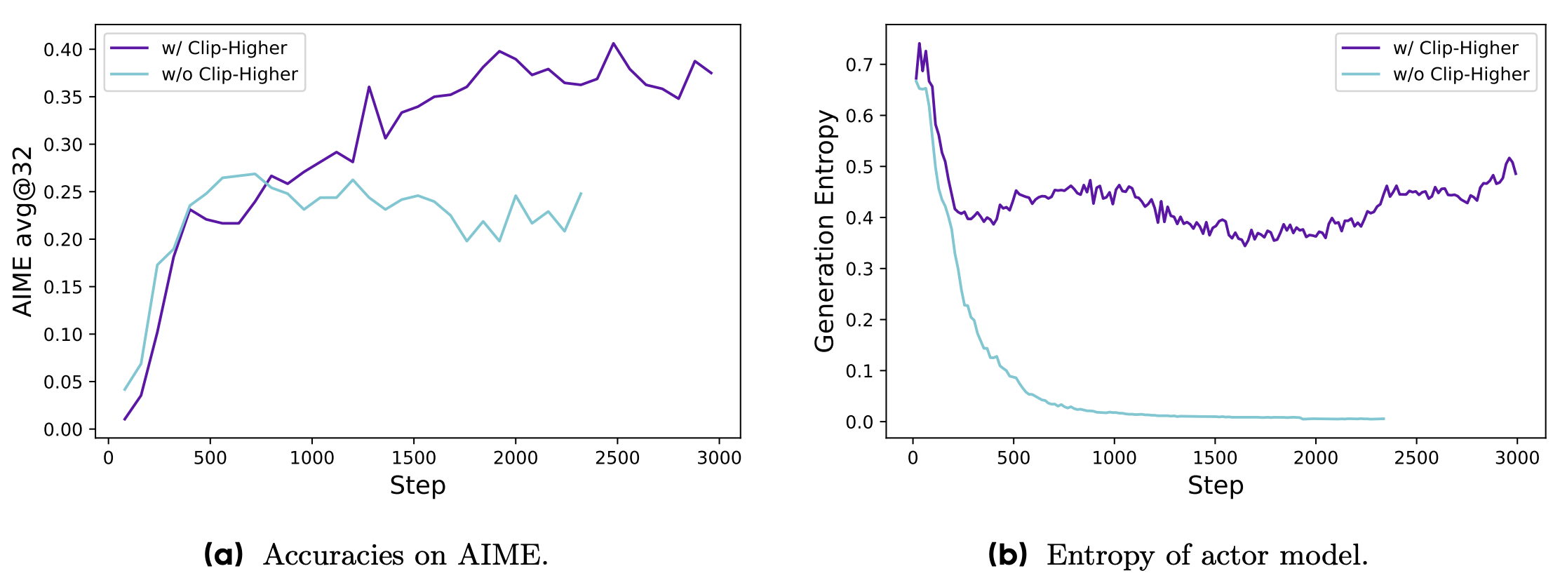 - Clip-Higher:提升系统多样性,避免熵坍缩;