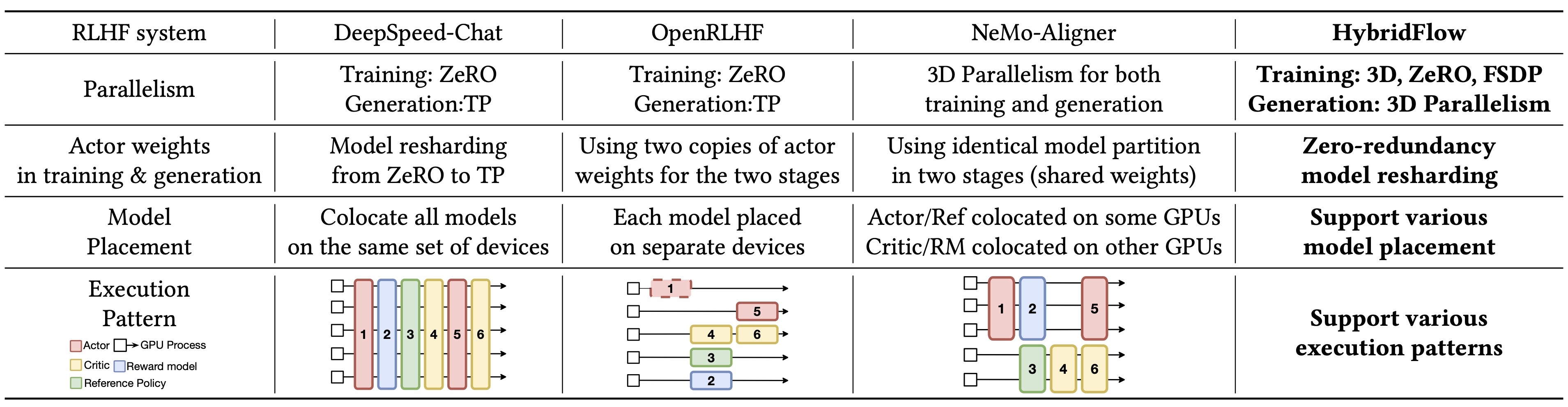 RLHF 执行效率低下:表 1 总结了现有 RLHF 系统所采用的并行策略、模型放置方式和执行模式。DeepSpeed-Chat 和 OpenRLHF 在 actor 模型训练时采用 ZeRO-3 方法,在 actor 模型生成时采用张量并行(TP)方法。OpenRLHF 在不同设备上使用 actor 模型的不同副本进行训练和生成,这导致了内存的冗余使用以及设备之间频繁的权重同步。DeepSpeed-Chat 在同一组设备上为训练和生成维护 actor 模型的相同副本,并在训练和生成之间对模型权重进行重新分片(因为两个阶段使用了不同的并行策略),对于大型模型来说,这仍然可能会产生大量的内存和通信开销。NeMo-Aligner 在 actor 模型的训练和生成中使用相同的三维并行配置,其生成吞吐量较低。