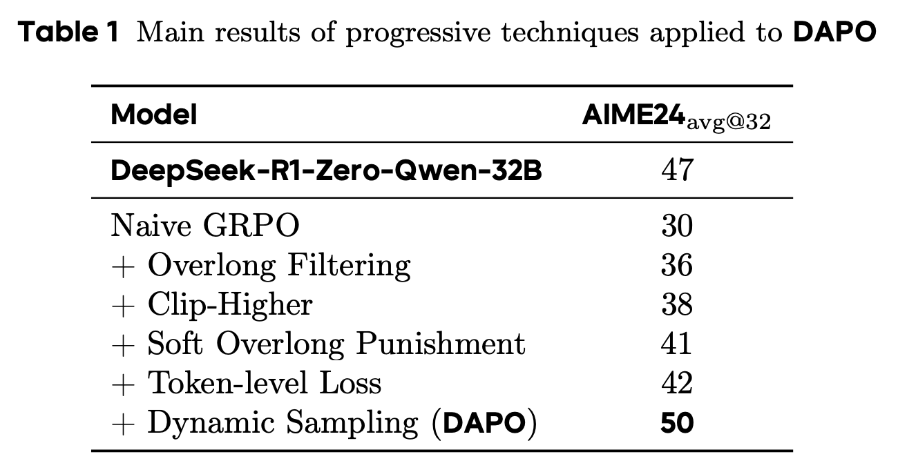 为填补这一空白,作者开源了先进的大规模 LLM RL 系统 —— 基于 Qwen2.5-32B 模型在 AIME 2024 中取得 50 分,仅用 50% 训练步数即超越 DeepSeek-R1-Zero-Qwen-32B 模型的 47 分。作者提出解耦裁剪与动态采样策略优化算法(DAPO),并引入 4 项关键技术以实现长思维链 RL 场景下的高效训练: